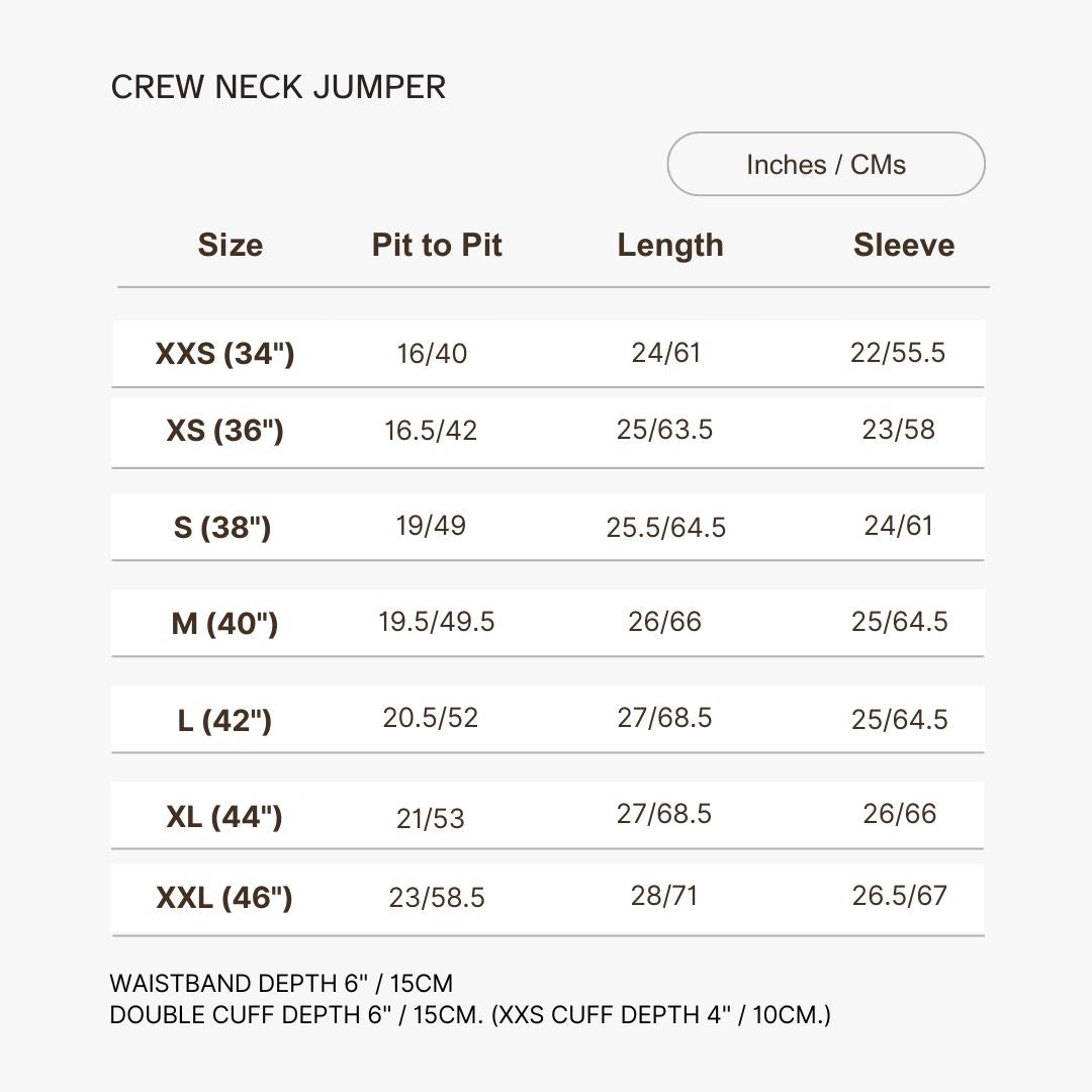 The unique crew neck shape and cut is directly reproduced from an early 20th century Royal Naval pattern jumper, while the deep waistband and double cuff design is directly inspired from an original mid 20th century varsity jumper.