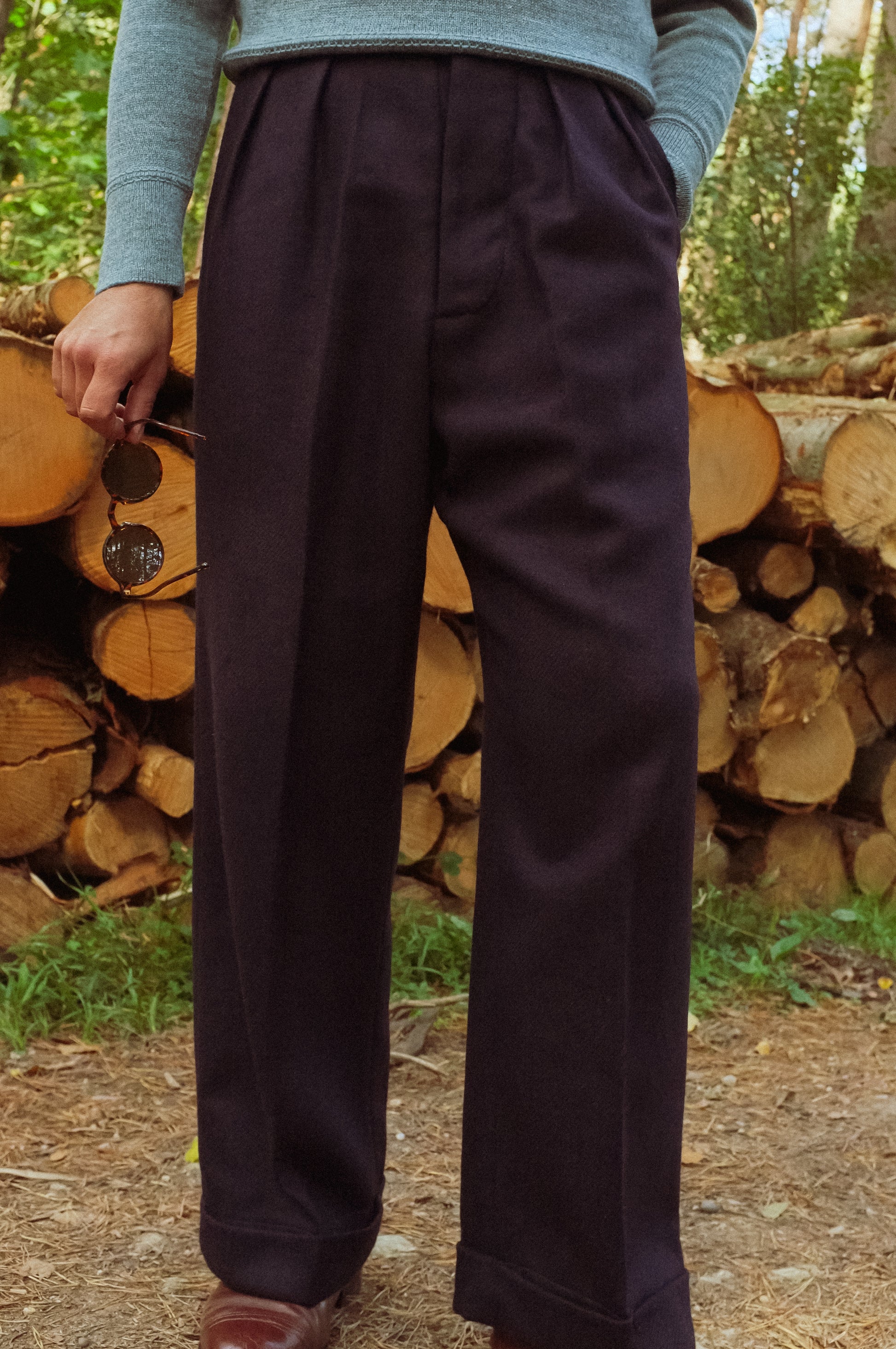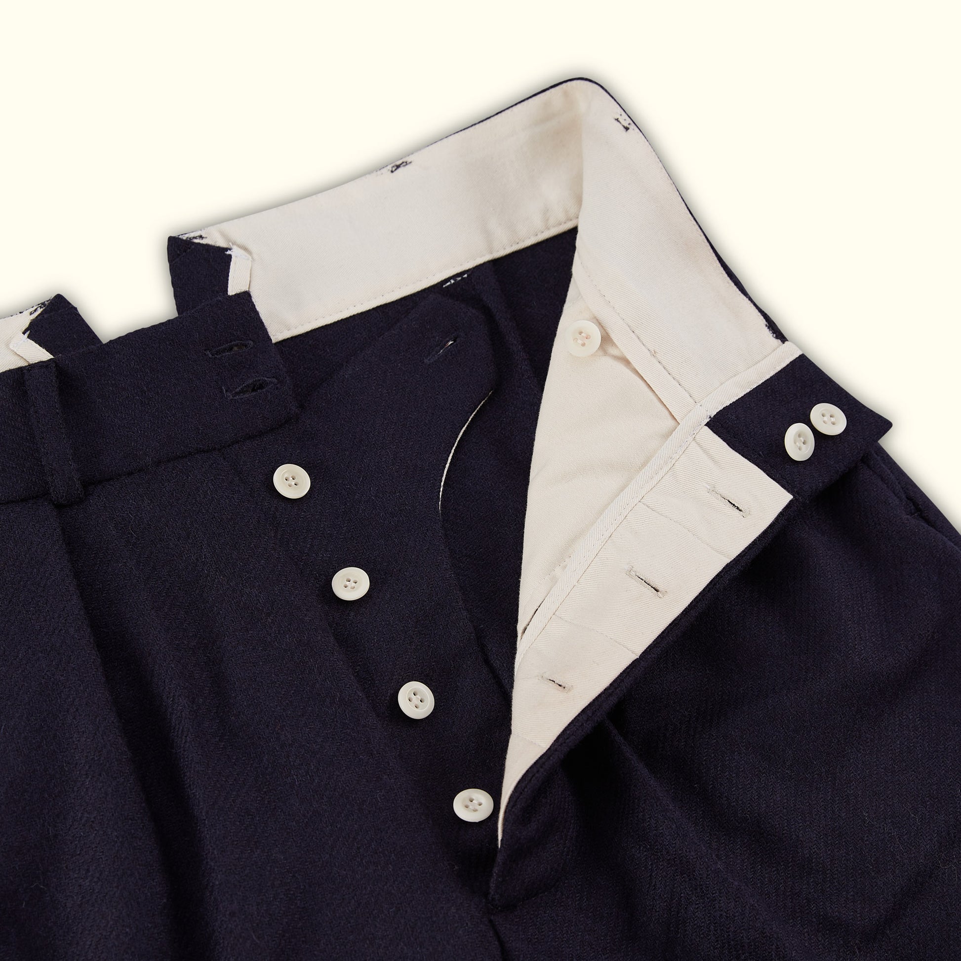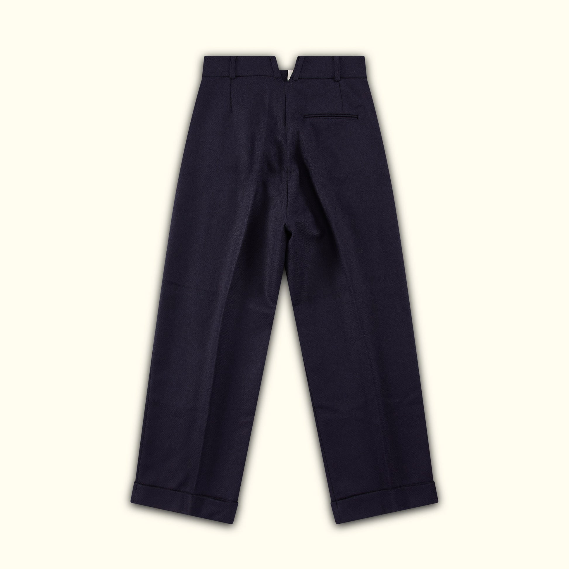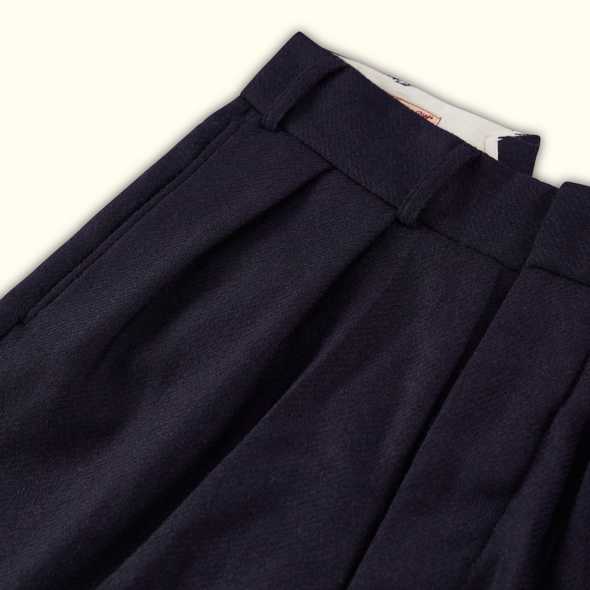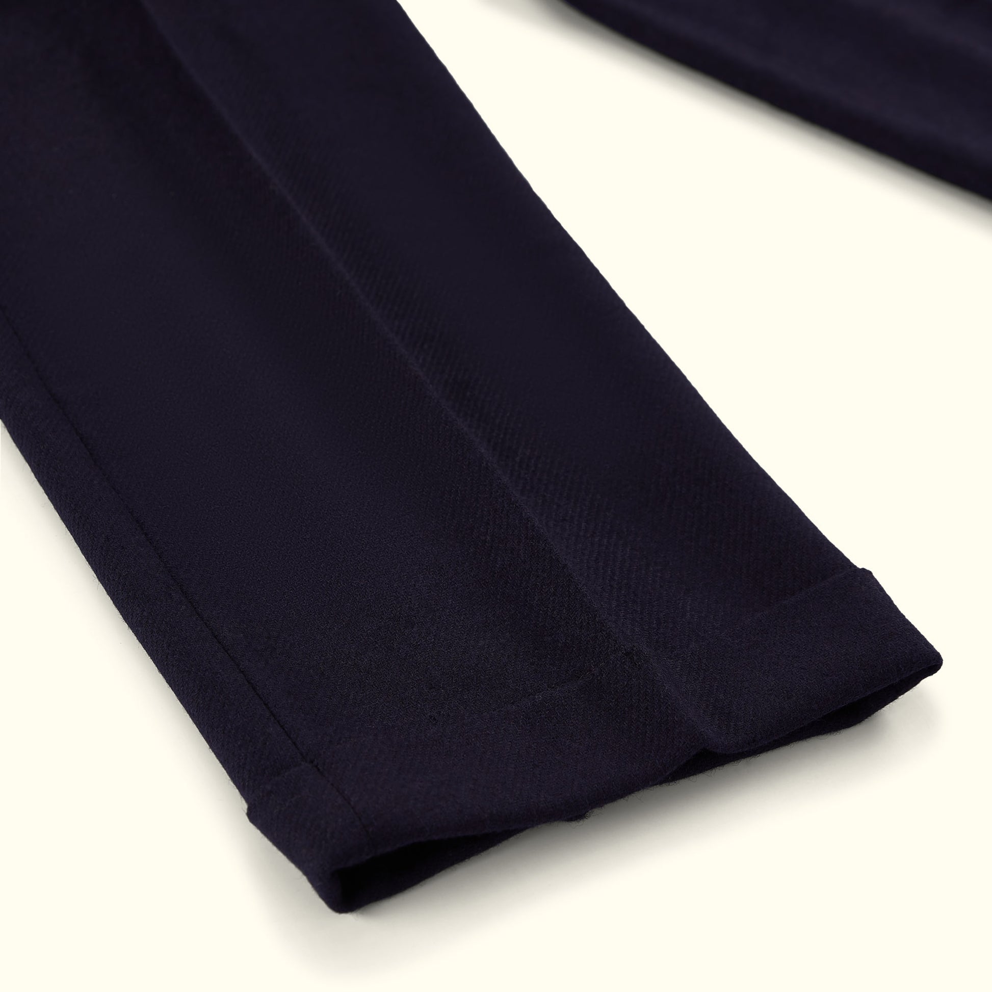 Crafted in England from a richly textured dark navy herringbone wool woven by Abraham Moon & Sons, these trousers are tailored to our trusted 1930s pattern: featuring a high rise, elegant double forward pleats, a split “V” rear waistband for ease, and a wide-leg profile that drapes cleanly from hip to hem. The 2" turn-up at the cuff adds structure, while a generous seat and thigh allow for comfortable movement.
