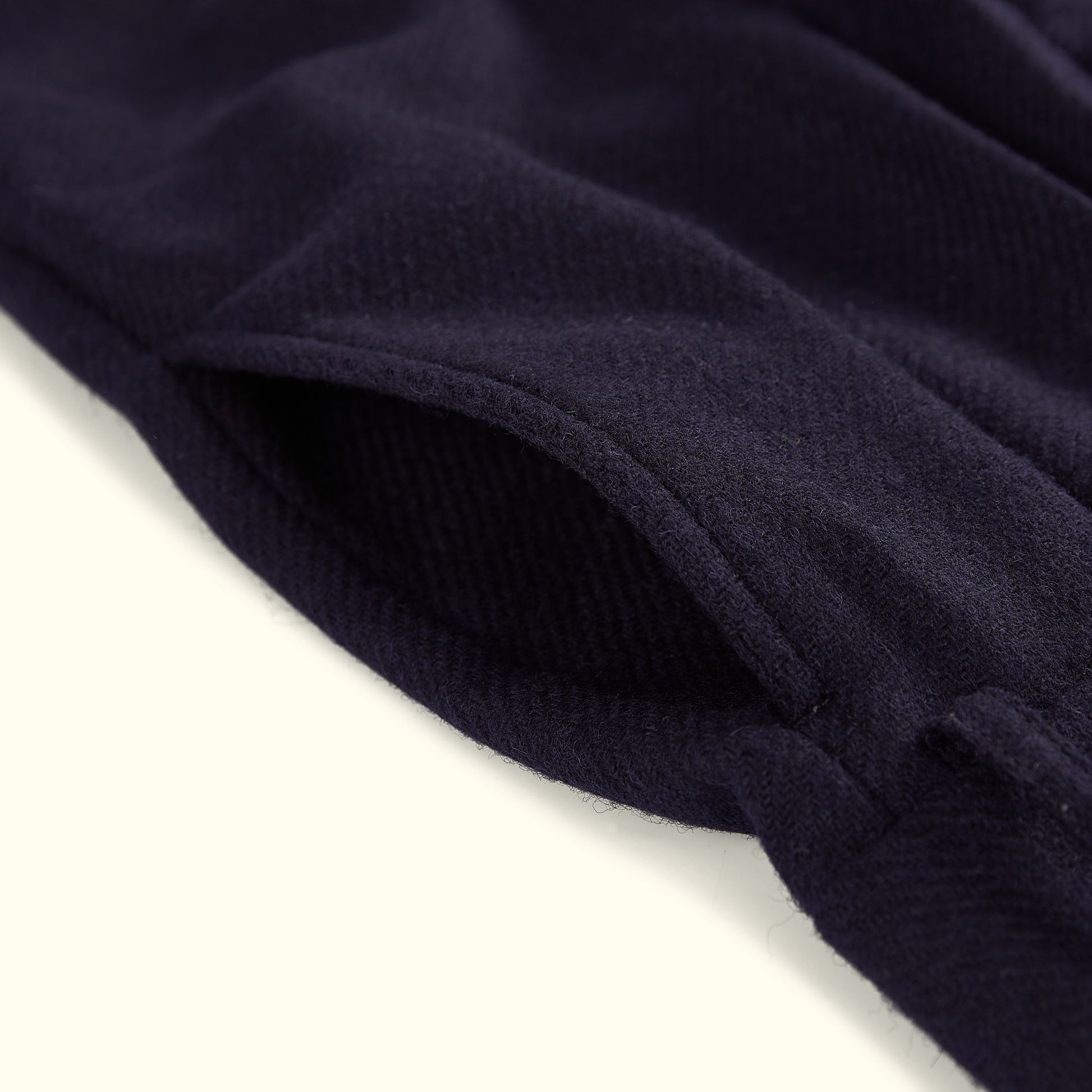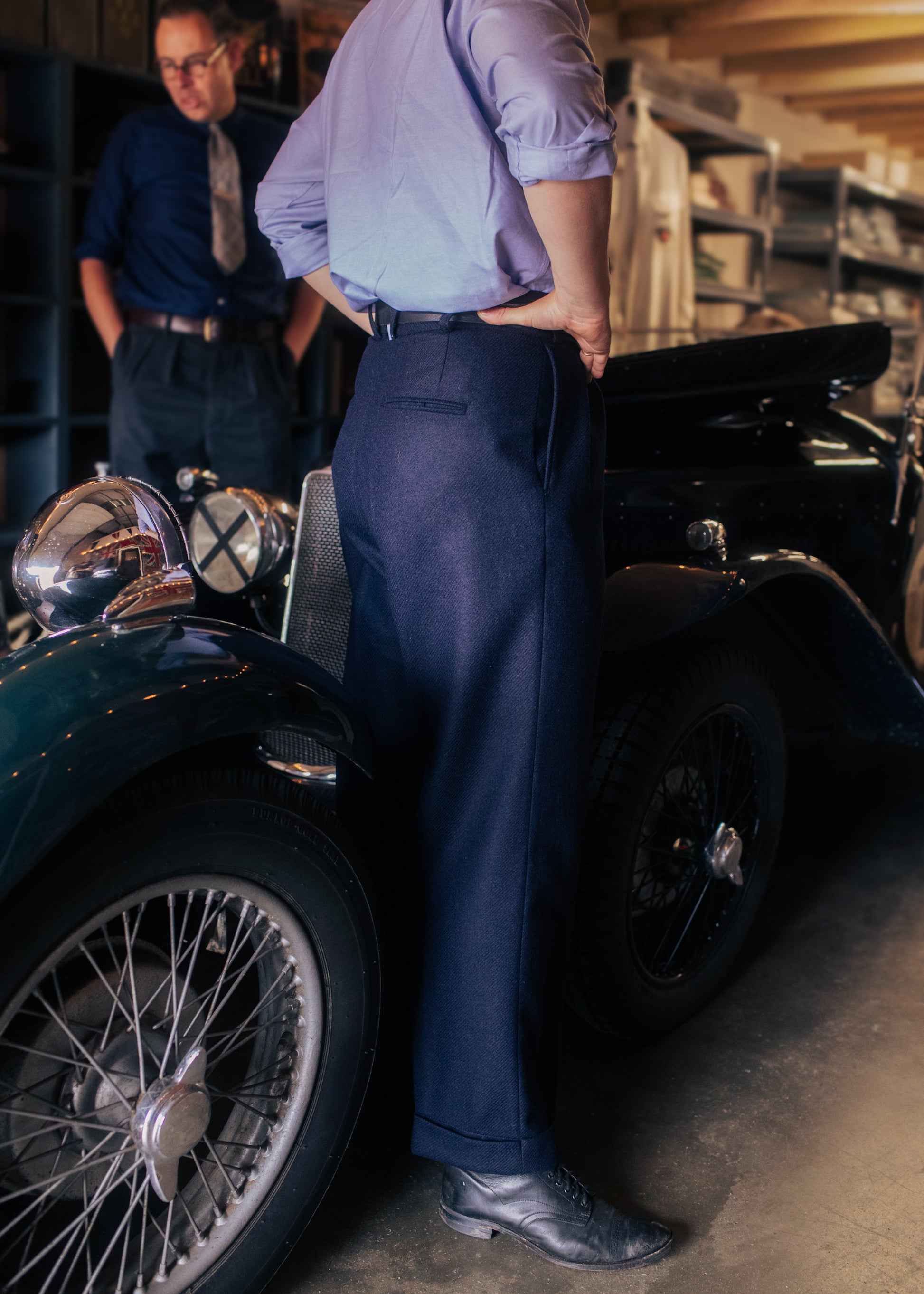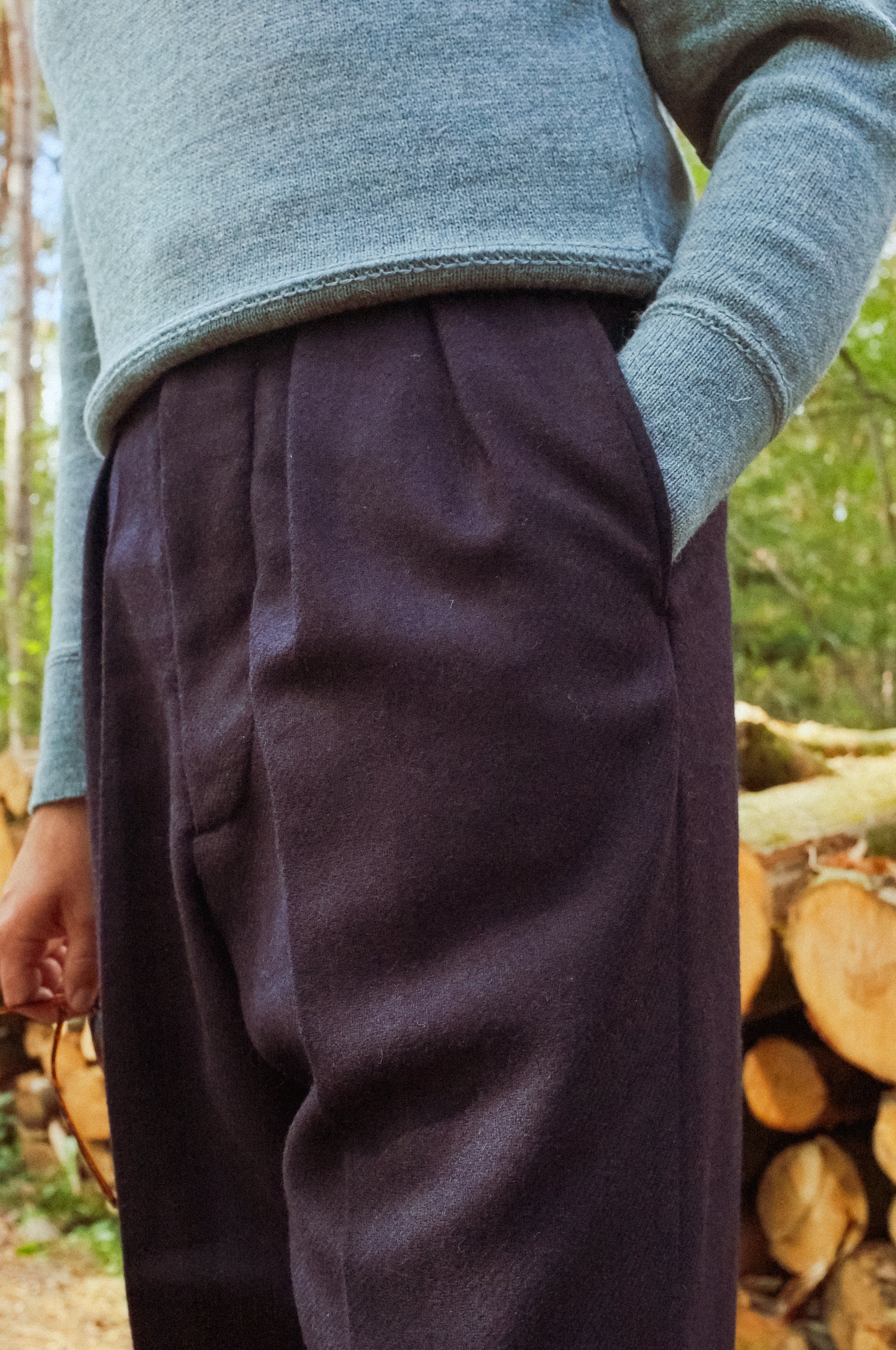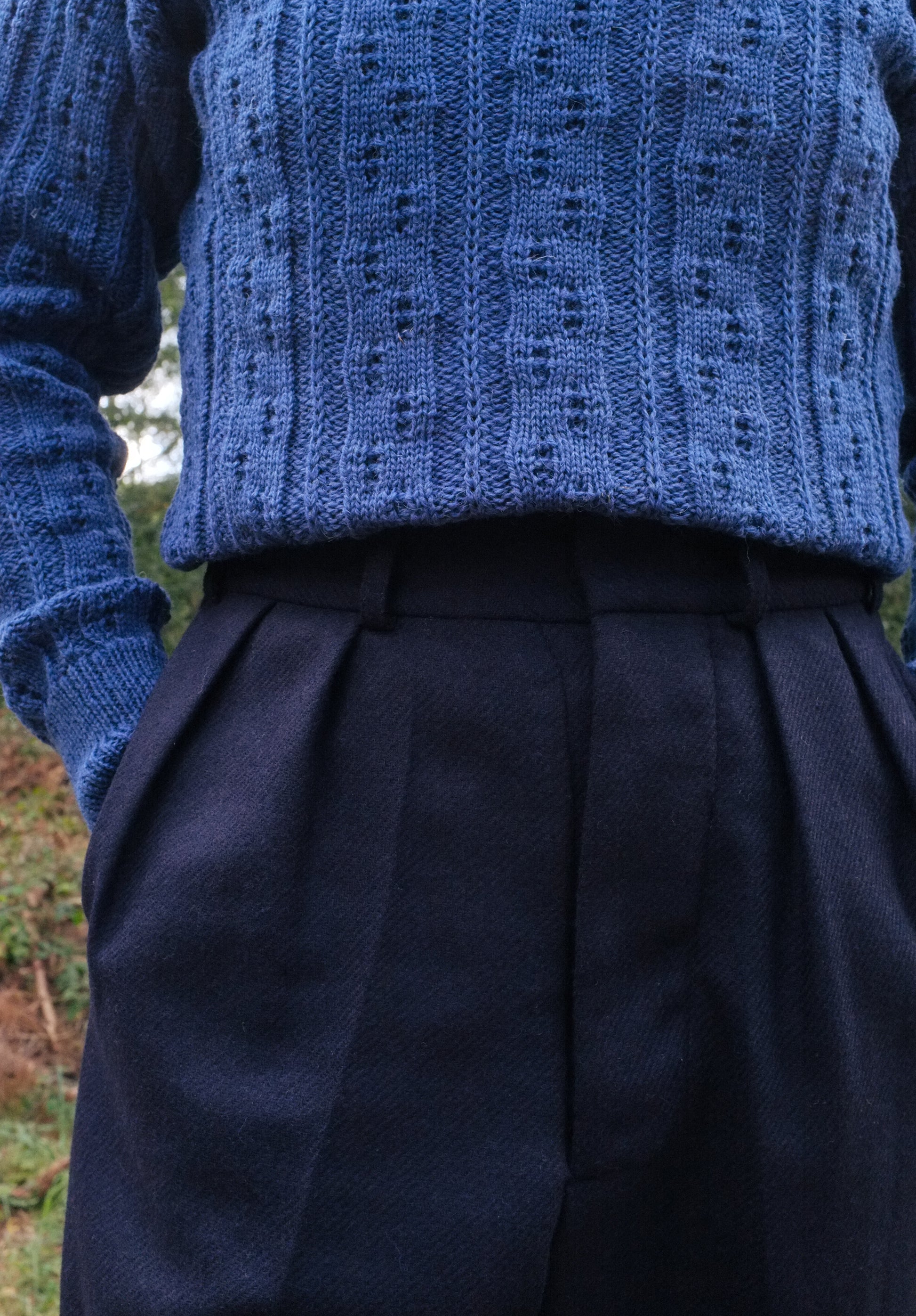 Crafted in England from a richly textured dark navy herringbone wool woven by Abraham Moon & Sons, these trousers are tailored to our trusted 1930s pattern: featuring a high rise, elegant double forward pleats, a split “V” rear waistband for ease, and a wide-leg profile that drapes cleanly from hip to hem. The 2" turn-up at the cuff adds structure, while a generous seat and thigh allow for comfortable movement.