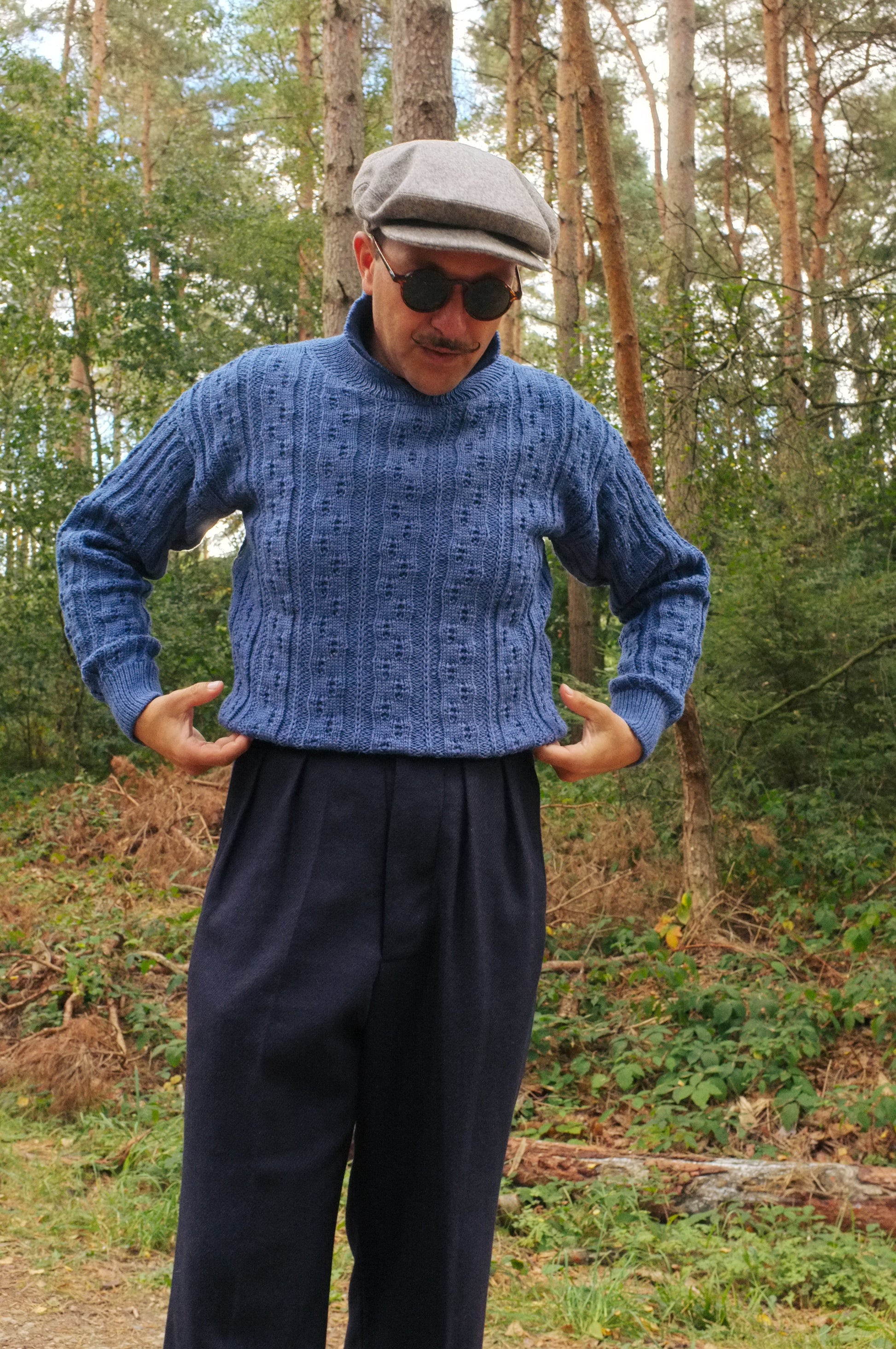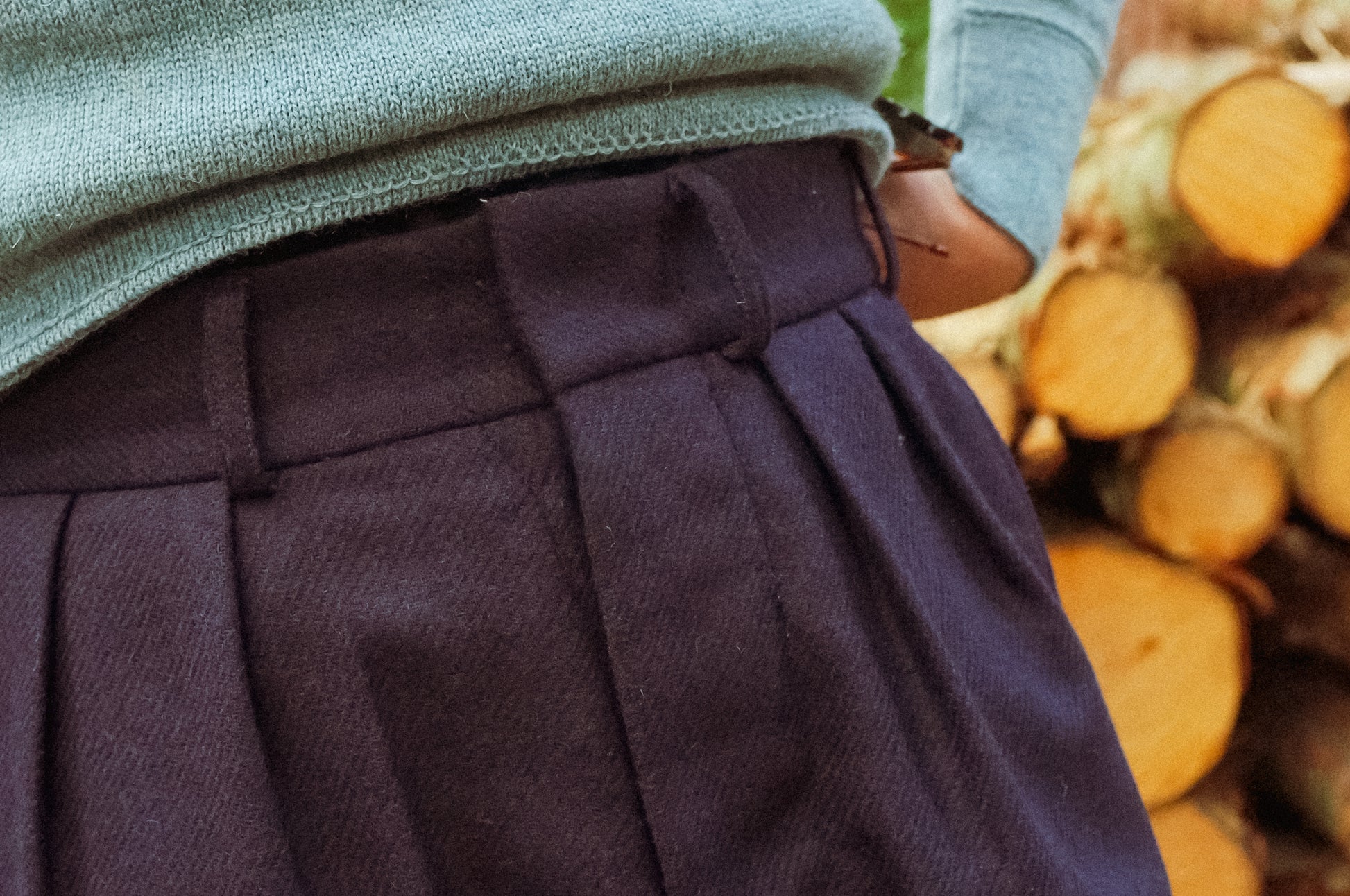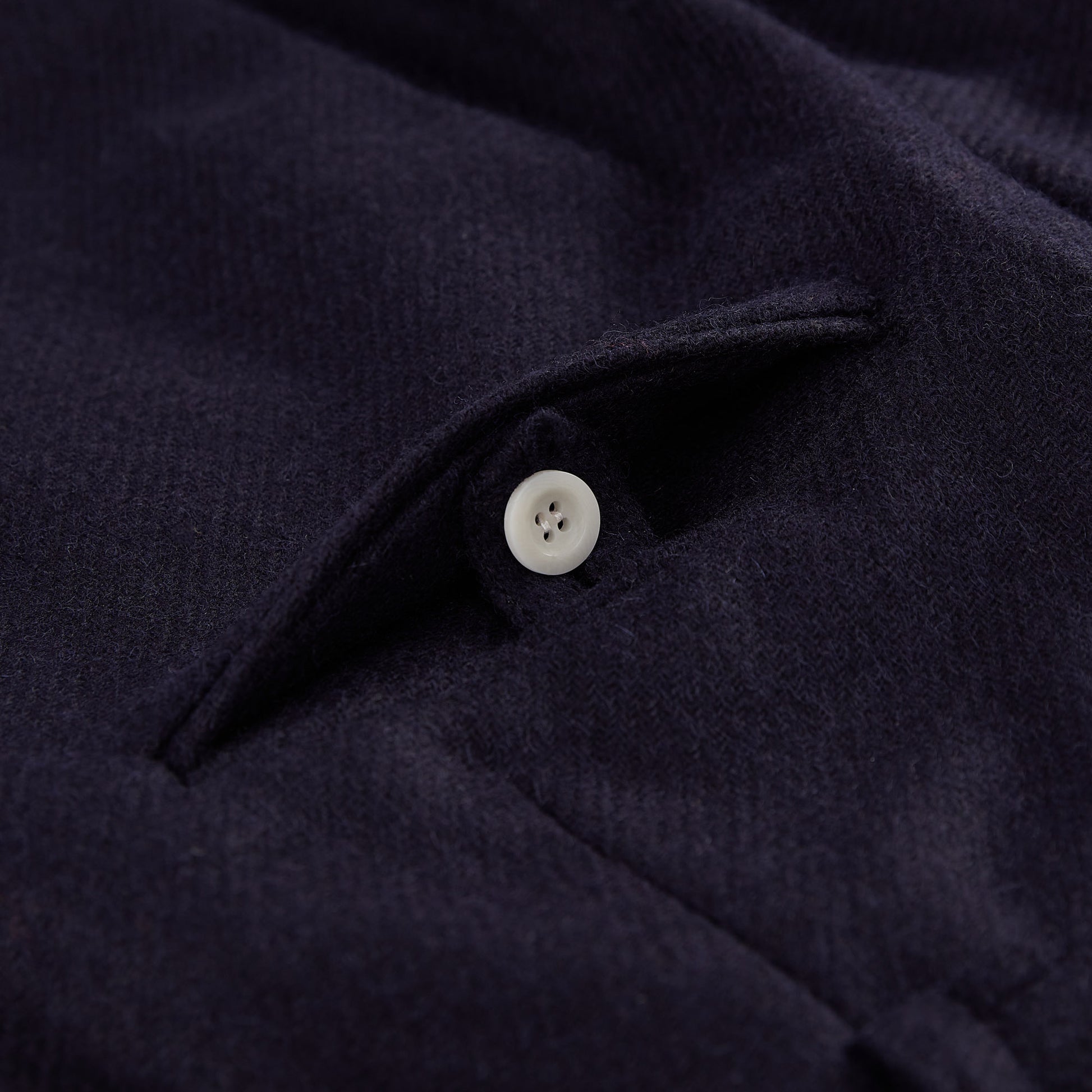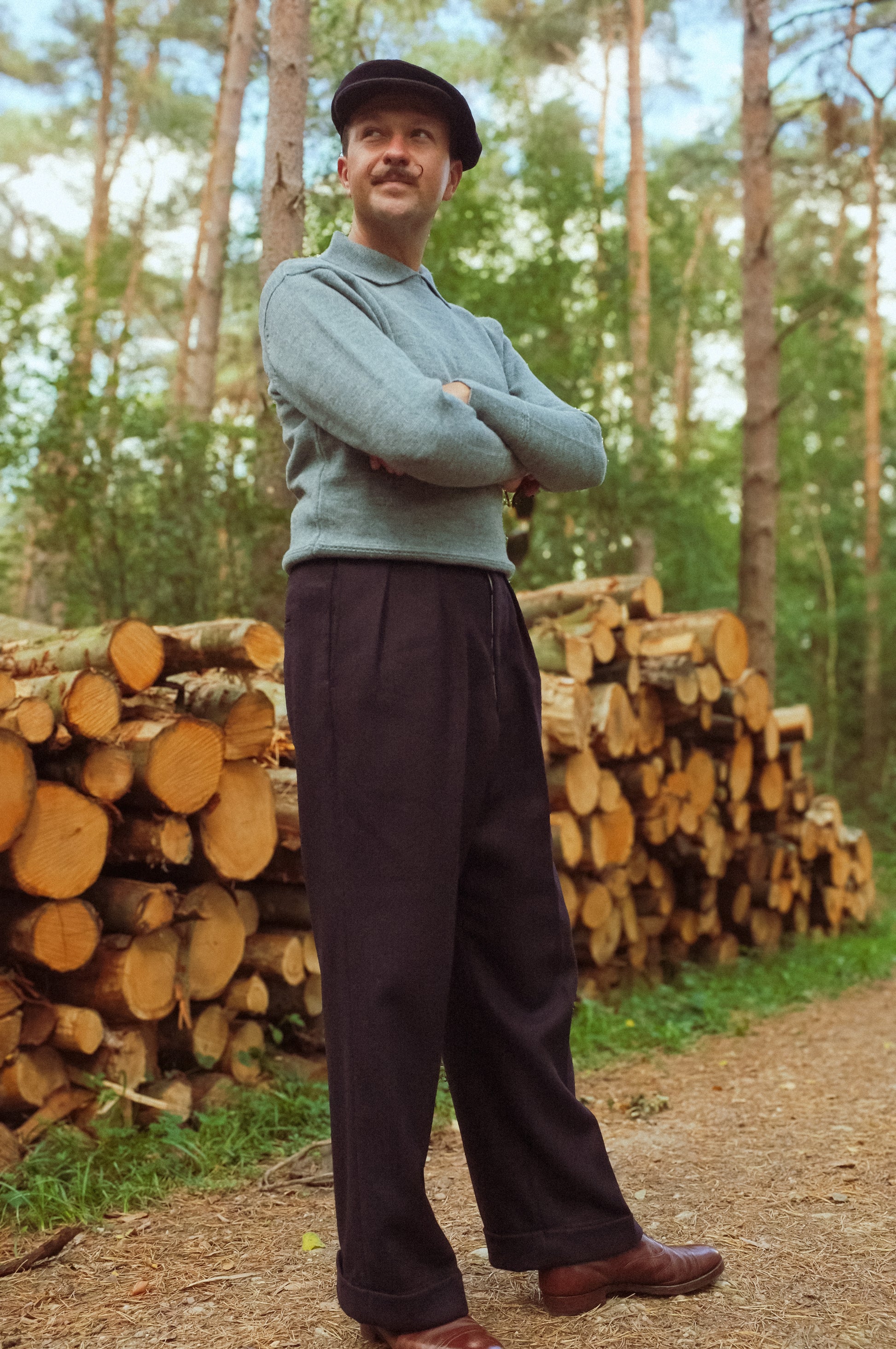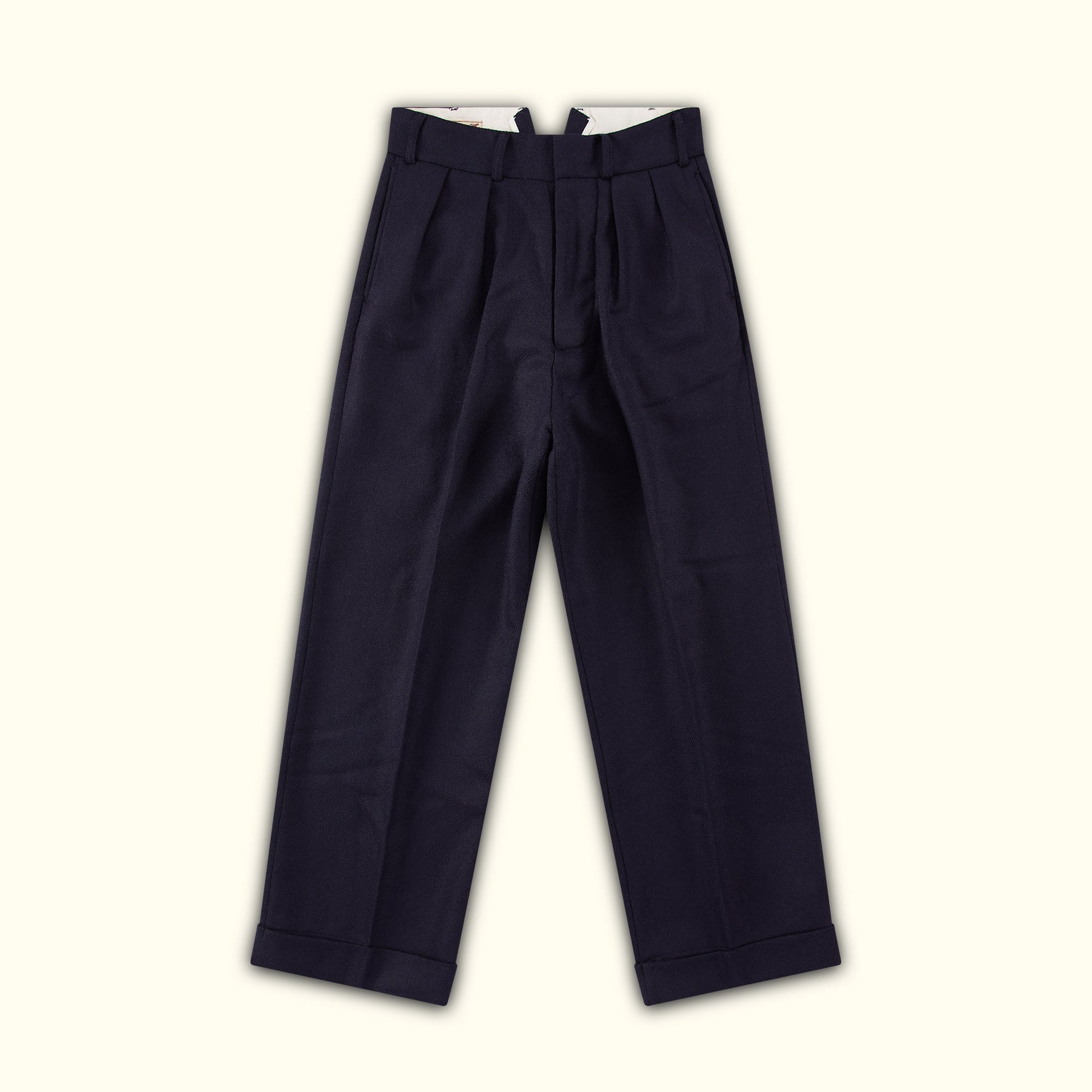 Crafted in England from a richly textured dark navy herringbone wool woven by Abraham Moon & Sons, these trousers are tailored to our trusted 1930s pattern: featuring a high rise, elegant double forward pleats, a split “V” rear waistband for ease, and a wide-leg profile that drapes cleanly from hip to hem. The 2" turn-up at the cuff adds structure, while a generous seat and thigh allow for comfortable movement.