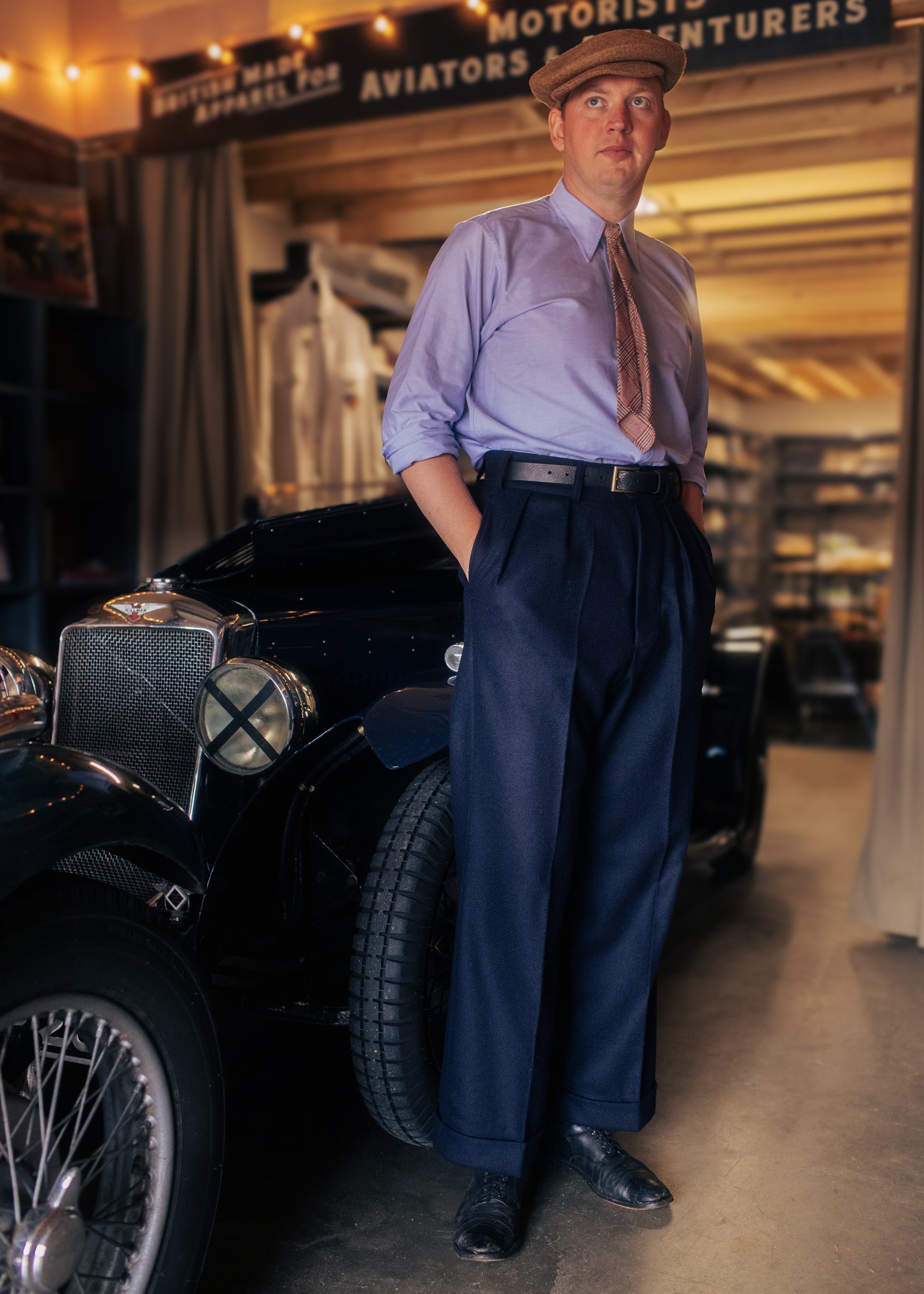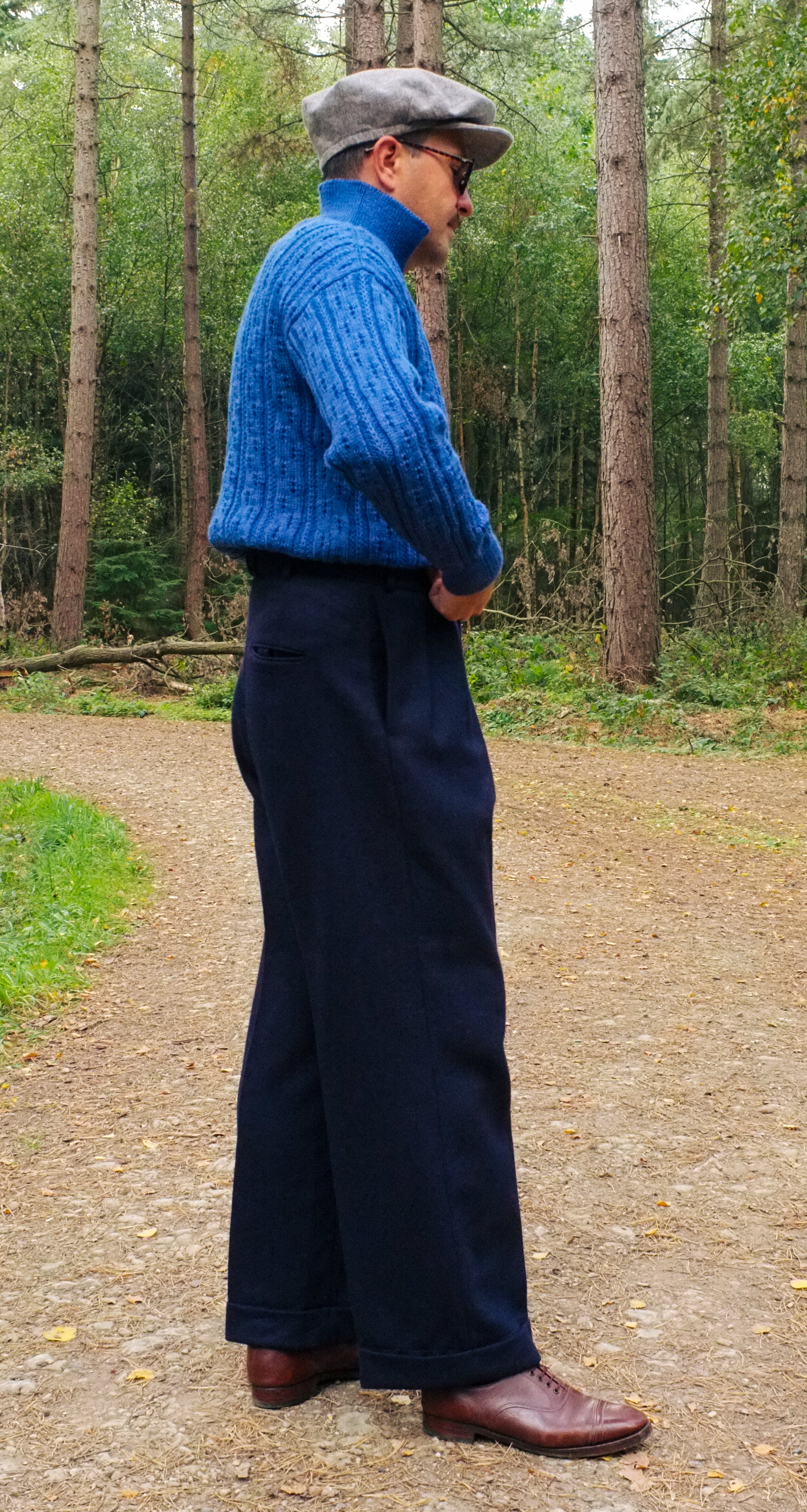 Authentic 1930s silhouette: high waist, wide leg, double forward pleats