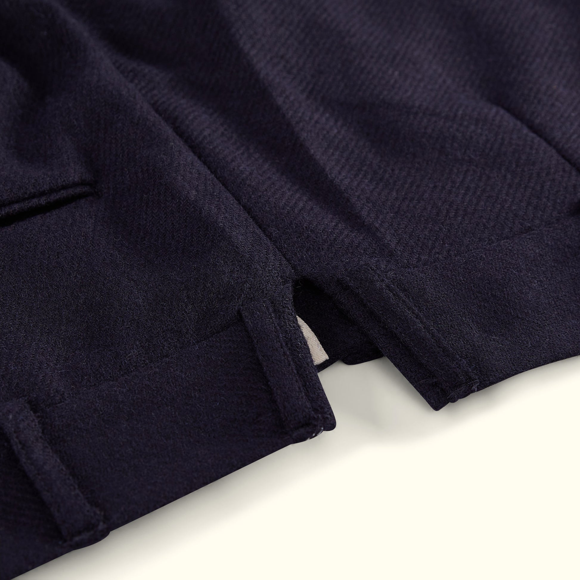 100% British wool (11oz dark navy herringbone, Abraham Moon)
