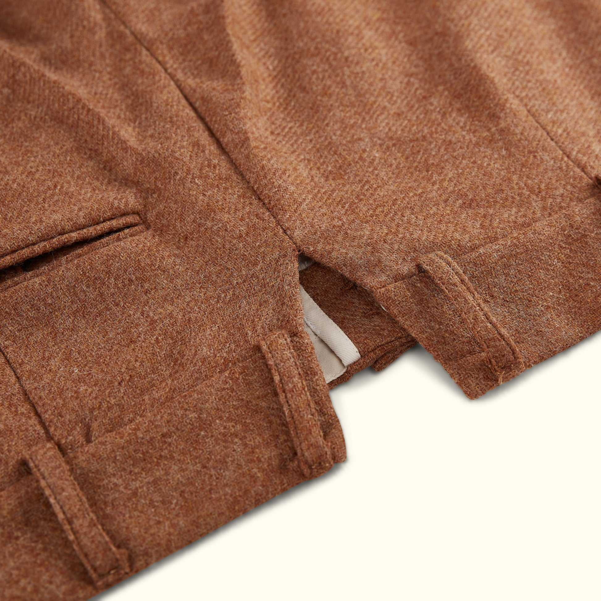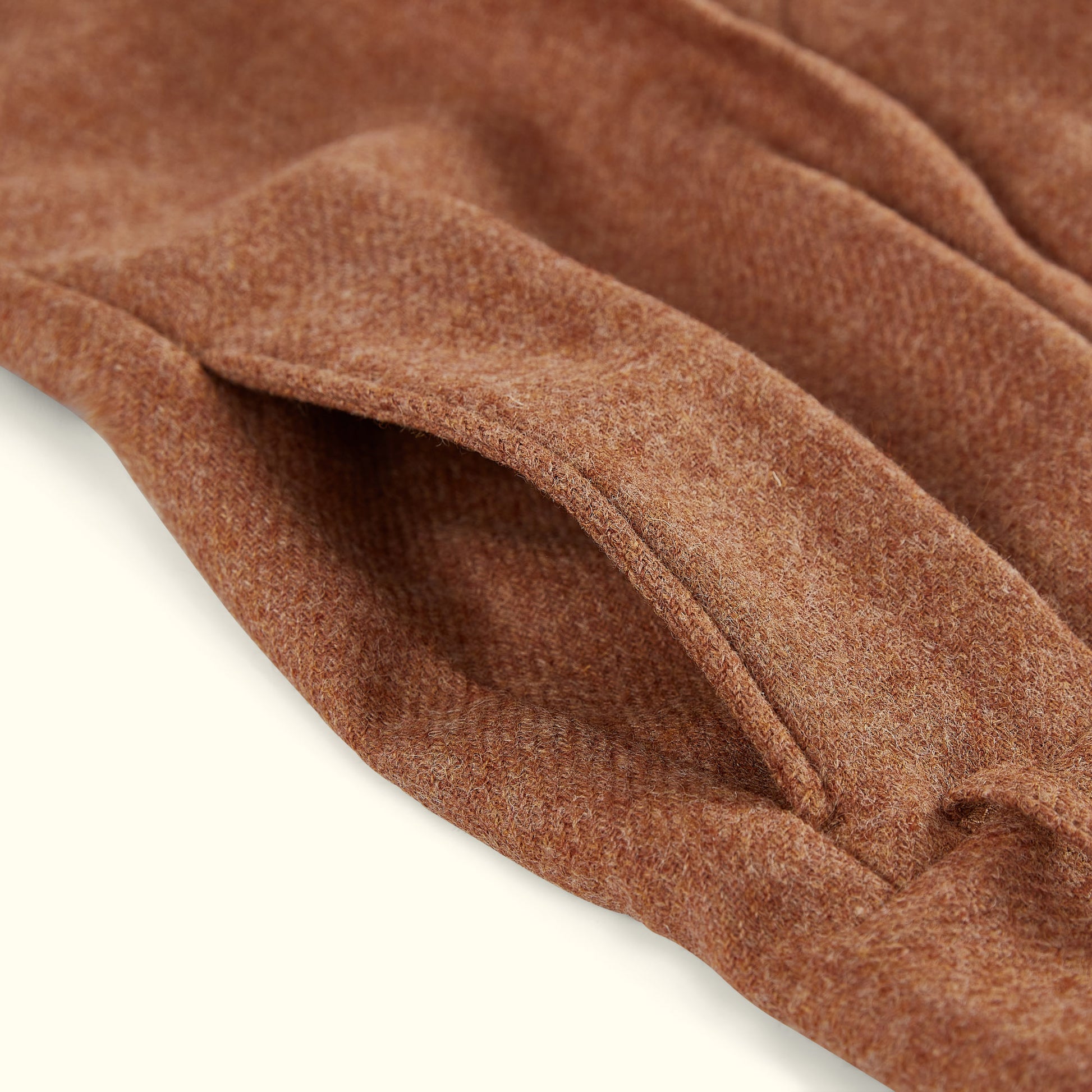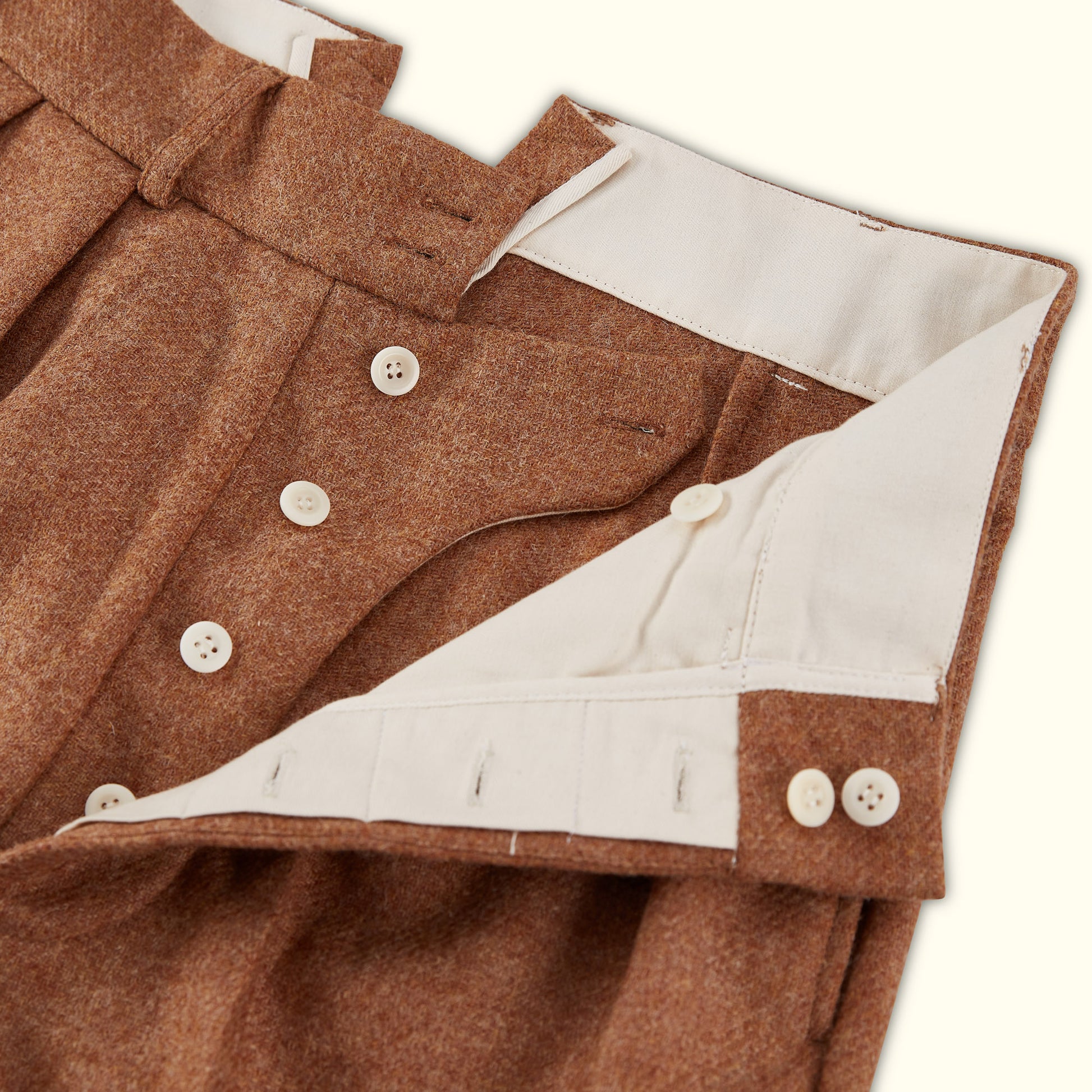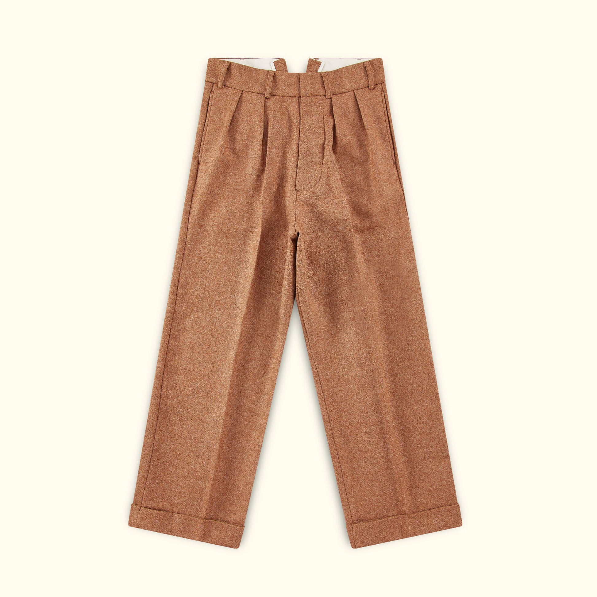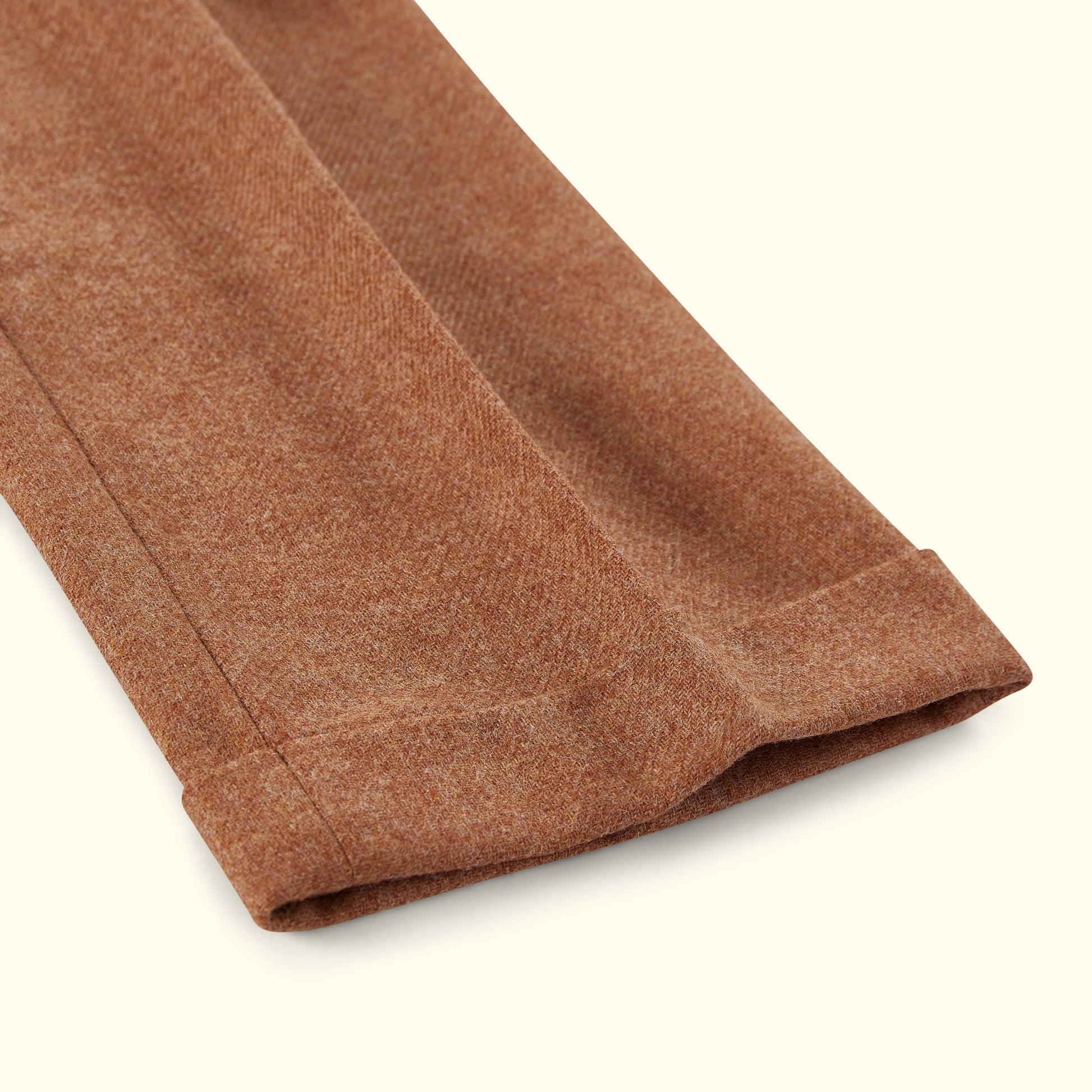 This is the warmest tone in our heritage wool trouser line — a golden fawn woven by Abraham Moon using traditional methods in Yorkshire. Built on the same faithful 1930s tailoring pattern used for our Wingfield and Melbourne trousers, The Creswell features a high rise, double forward pleats, and a wide-leg silhouette with a 10" hem and 2" turn-up for structured, elegant movement.