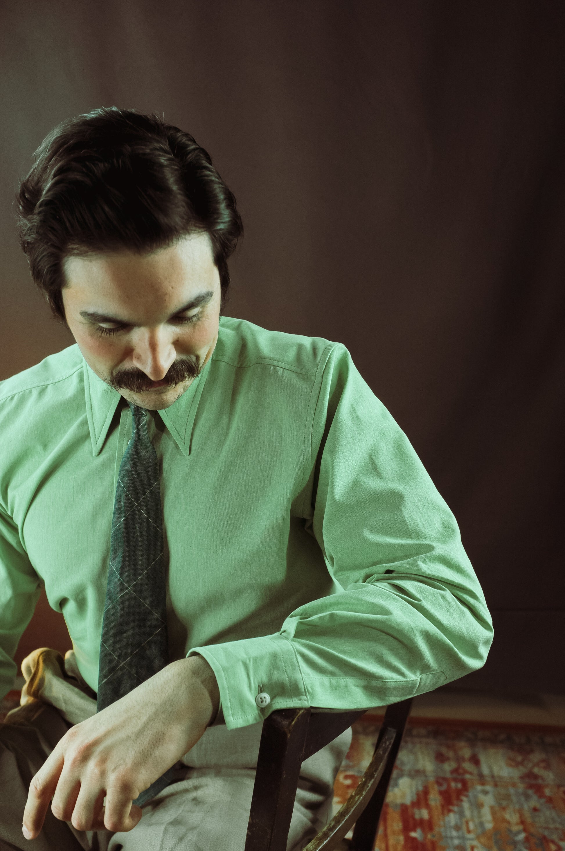 The Newton Shirt, in a light green linen cotton has some key characteristics. It is single cuffed, full fronted and with a mid ‘spearpoint’ collar, ideal for wearing with our without a tie.